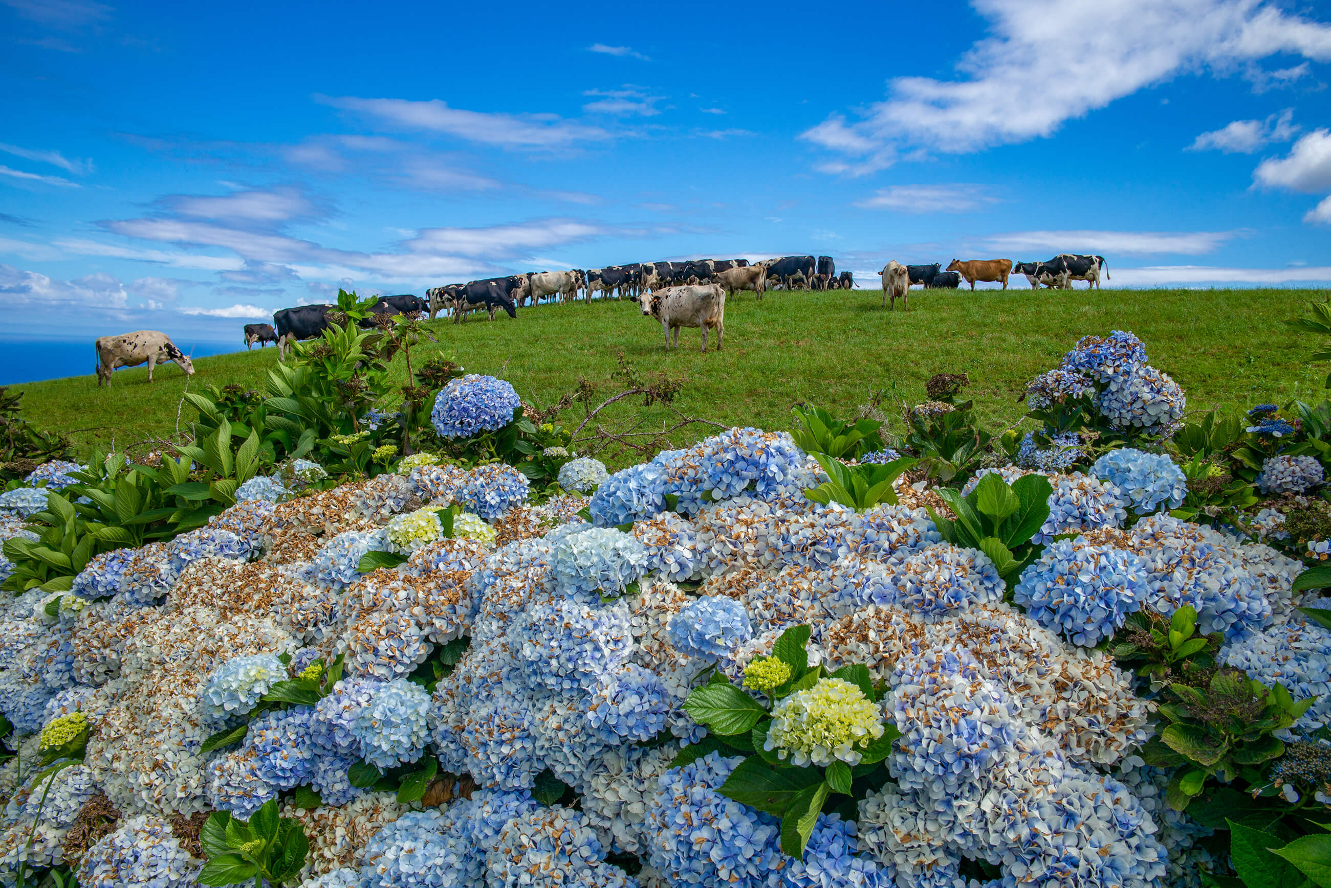 Faial – ,,modrý ostrov" známe modrými hortenziami, ktoré lemujú cesty a pastviny.